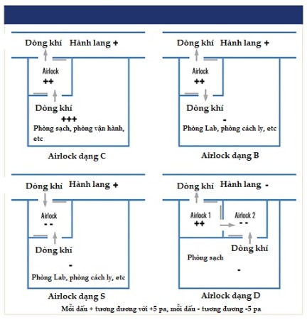 Chốt gió Airlock có thể được phân loại thành các loại "C", "B", "S" và "D"; mỗi loại thể hiện các hướng luồng khí khác nhau và chênh lệch áp suất giữa môi trường được kiểm soát, Airlock và hành lang. Dưới đây là thông tin chi tiết cho 4 loại Airlock này.