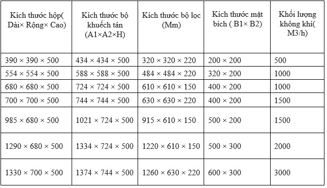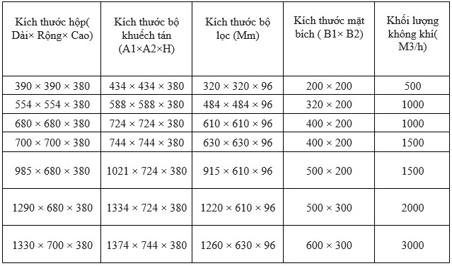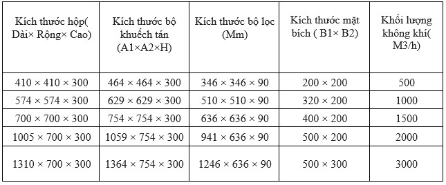 Một số kích thước tham khảo và thông số tiêu chuẩn của hộp lọc HEPA.