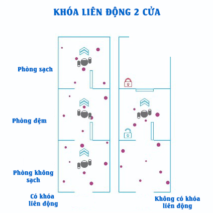 Điều này có thể hiểu là chúng ta không thể mở cửa số 1 nếu cửa số 2 đang mở, và phải đóng cửa số 2 lại trước khi tiến hành mở cửa số 1. Như vậy luồng không khí từ khu vực không sạch sẽ không thể tiếp cận khu vực sạch, đảm bảo an toàn tránh lây nhiễm chéo.