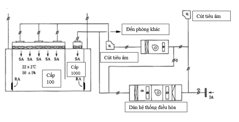 Một khu vực cấp 100 có diện tích nhỏ có thể được trang bị hệ thống hút chụp dòng chảy tầng, có kèm quạt gió để lưu thông không khí, đồng thời nhiệt độ và tiếng ồn đều là vấn đề. Một khu vực cấp trăm vượt quá diện tich nhất định. Cần xem xét các yếu tố tổng hợp như tiếng ồn, nhiệt độ, lượng gió sơ cấp, chi phí xây dựng và chi phí vận hành. Giải pháp được đề xuất là chụp dòng chảy tầng dẫn gió, chụp dòng chảy tầng cấp 100 sử dụng thiết bị sử dụng thiết bị để cấp gió và gió sơ cấp từ thiết bị điều hòa không khí được dẫn đến tổ cấp dẫn gió cấp 100 (xem Hình 2).