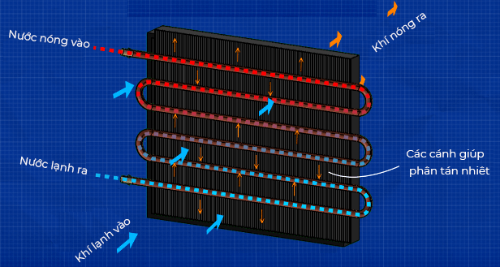 Ví dụ, khi được sử dụng để sưởi không khí, sử dụng nước nóng. Nước nóng chảy vào bên trong ống và truyền năng lượng nhiệt của nó bằng đối lưu vào thành ống, có sự chênh lệch nhiệt độ giữa nước nóng và không khí để nhiệt được truyền qua vách ống. Không khí thoát ra bên ngoài mang theo nhiệt mới được truyền.