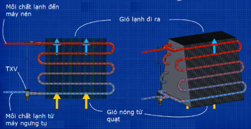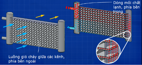 Môi chất lạnh đi qua phần trên và sau đó là các ống phẳng cho đến khi nó đạt đến phần trên khác. Các đầu chứa các vách ngăn điều khiển hướng của môi chất lạnh và được sử dụng để lặp môi chất lạnh qua các ống nhiều lần để tăng thời gian di chuyển bên trong và do đó tăng cơ hội truyền nhiệt.