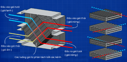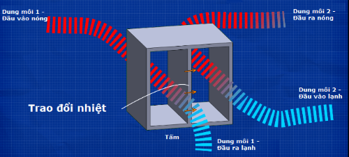 Nhiệt từ một luồng được truyền vào các tấm kim loại mỏng ngăn cách các luồng, sau đó được truyền qua kim loại nơi nó được mang đi bằng cách đối lưu cưỡng bức vào luồng khác.