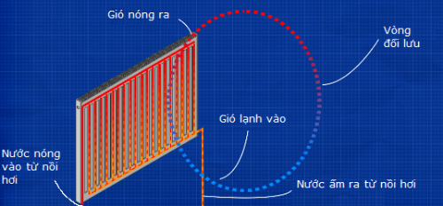 Nhiệt của nước được truyền bằng cách dẫn nhiệt đến các tường kim loại của bộ tản nhiệt. Ở bên ngoài bộ tản nhiệt là không khí của căn phòng chúng được lắp đặt. Khi không khí này tiếp xúc với bề mặt nóng của bộ tản nhiệt, nhiệt sẽ truyền vào không khí và điều này sẽ khiến không khí giãn nở và tăng lên. Không khí lạnh hơn sau đó di chuyển vào để thay thế không khí này gây ra một chu kỳ không khí chuyển động liên tục làm nóng căn phòng, do đó chuyển động này của không khí được gọi là sự truyền nhiệt đối lưu. Bộ tản nhiệt thường có một số cánh được nối ở phía sau hoặc ở giữa các tấm, đặc biệt là trên các tấm mới, chúng chỉ ở đó để mở rộng diện tích bề mặt của bộ tản nhiệt để tạo thêm cơ hội truyền nhiệt vào không khí. "Bộ tản nhiệt" là một cái tên không chính xác vì chúng truyền nhiệt chủ yếu qua đối lưu.