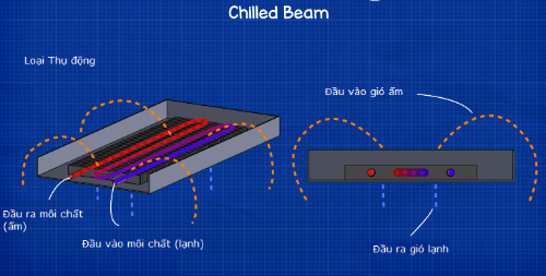 Chilled beam thụ động cũng sẽ sử dụng bộ trao đổi nhiệt dạng ống, nhưng chúng không có nguồn cấp không khí được kết nối với nhau. Thay vào đó, chúng tạo ra một dòng đối lưu tự nhiên bằng cách làm mát không khí ấm ở mức trần. Không khí lạnh này sau đó chìm xuống và được thay thế bằng không khí ấm hơn nơi chu kỳ lặp lại.