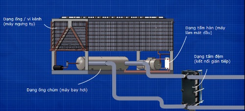 Một thiết bị làm lạnh hay một chiller sẽ sử dụng một trong các bộ trao đổi nhiệt dạng ống chùm, bộ trao đổi nhiệt dạng tấm hoặc bộ trao đổi nhiệt dạng ống. Một số Chiller đặc biệt có thể sẽ sử dụng kết hợp tất cả những bộ này. Ví dụ, một Chiller làm mát bằng không khí có thể sử dụng bộ trao đổi nhiệt ống chùm cho thiết bị bay hơi, bộ trao đổi nhiệt dạng ống hoặc bộ trao đổi nhiệt dạng vi kênh cho thiết bị ngưng tụ, bộ trao đổi nhiệt dạng tấm hàn để làm mát dầu máy nén và bộ trao đổi nhiệt dạng tấm đệm để kết nối gián tiếp máy làm lạnh đến mạch làm mát trung tâm.