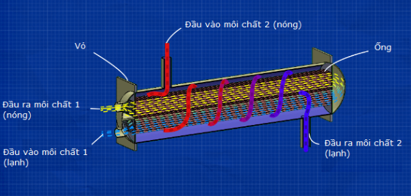 Đây là một thiết kế đơn giản của bộ trao đổi nhiệt dạng ống chùm. Nó có một thùng chứa bên ngoài được gọi là vỏ. Bên trong vỏ là một số ống dài. Các ống chứa một môi chất và vỏ chứa một môi chất khác. Hai môi chất được ngăn cách bởi các thành ống, chúng không bao giờ gặp nhau hoặc trộn lẫn vào nhau. Các môi chất sẽ ở các nhiệt độ khác nhau khiến năng lượng nhiệt được truyền giữa các môi chất và năng lượng nhiệt này sẽ đi qua các thành ống. Khi được sử dụng trong thiết bị bay hơi hoặc ngưng tụ, hai môi chất sẽ là nước và chất làm lạnh. Tùy thuộc vào thiết kế, nước có thể ở trong vỏ hoặc ống và chất làm lạnh sẽ ở trong ống kia.