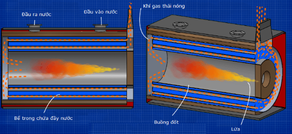 Nhiên liệu được đốt trong buồng đốt (thường là khí hoặc dầu) và các khí thải nóng được dẫn qua một số ống dẫn đến ống khói và được thải ra môi trường. Các ống và buồng đốt được bao quanh bởi nước. Nhiệt đối lưu với thành ống và sau đó được dẫn vào trong nước, sau đó được mang đi bằng đối lưu. Tùy thuộc vào thiết kế của hệ thống, nước có thể tồn tại dưới dạng nước nóng hoặc hơi nước. Nước này được ép bởi một máy bơm, tốc độ của máy bơm cũng như lượng nhiên liệu được đốt có thể thay đổi để thay đổi nhiệt độ và tốc độ dòng chảy.