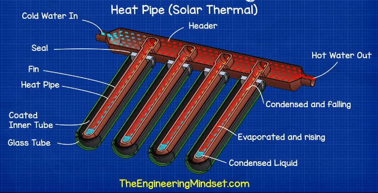 Ống dẫn nhiệt là một ống đồng kín, dài, rỗng, chạy dọc theo chiều dài của ống thủy tinh và có một phần nhô ra ở phía trên. Các ống kết nối vào một thân ống dài và nước mát được chảy qua thân ống để đến đầu các ống dẫn nhiệt.