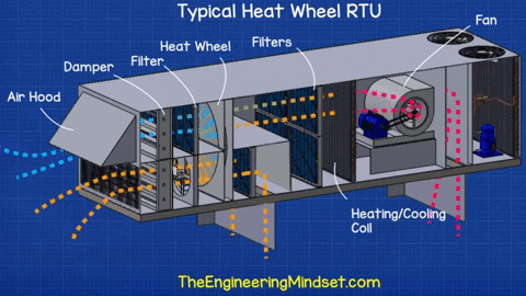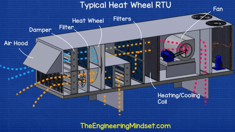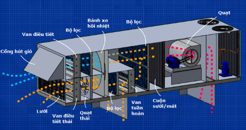 và đôi khi làm mát khi điều kiện phù hợp, tiết kiệm chi phí năng lượng và tiện ích. Sau khi đi qua bánh xe hồi nhiệt, không khí sẽ gặp 1 bộ lọc khác. Ngay trước bộ lọc này, chúng ta nhận thấy có 1 van điều tiết dòng gió thải tuần hoàn. Điều này sẽ cho phép chúng ta tuần hoàn một phần gió thải vào gió tươi và tỷ lệ có thể được thay đổi bằng cách đóng mở van điều tiết phù hợp. Không phải tất cả các RTU sử dụng bánh xe hồi nhiệt đều có thiết kế này, một số chỉ sử dụng 100% lượng gió tươi và xả ra toàn bộ gió thải (Xem ảnh bên). Nếu nó không có tùy chọn để tuần hoàn thì RTU có thể sẽ không có bộ lọc thứ hai này.