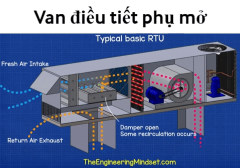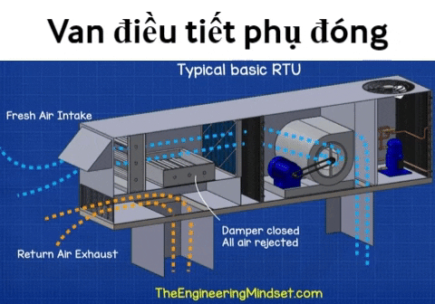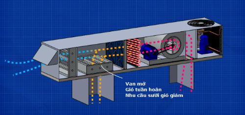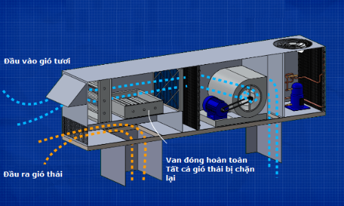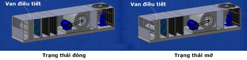 Khi van điều tiết đóng , sẽ là hệ thống 100% gió tươi. Khi van điều tiết mở ra, quạt sẽ hút gió thải từ ống gió.