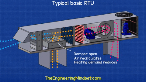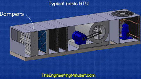 Bộ phận tiếp theo là một số van điều tiết. Không phải mọi RTU đều có bộ phận này nhưng các thiết kế mới hơn thường có chúng. Về cơ bản, đây là những tấm kim loại quay cùng nhau. Chúng có thể mở hoàn toàn để cho phép không khí đi vào thiết bị hoặc đóng hoàn toàn để bịt kín thiết bị và ngăn không khí đi vào hoặc rời khỏi. Khi cần thiết, chúng có thể mở hoặc đóng 1 phần để điều chỉnh lưu lượng không khí vào, ra thiết bị.