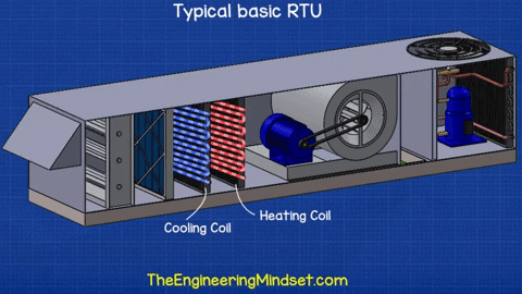 Sau các bộ lọc, chúng ta sẽ thấy các cuộn trao đổi nhiệt. Những cuộn này sẽ được sử dụng để làm mát hoặc làm nóng không khí bằng cách thêm hoặc loại bỏ năng lượng nhiệt. Tùy thuộc vào vị trí của khu vực đặt RTU và điều kiện môi trường xung quanh, một số thiết bị sẽ chỉ có cuộn làm mát, đôi khi chỉ có cuộn sưởi và một số sẽ có cả cuộn sưởi và cuộn làm mát.