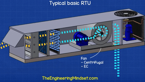 Sau cuộn trao đổi nhiệt sẽ là quạt. Đây thường là loại quạt ly tâm điều khiển bằng dây đai nhưng cũng có thể là loại quạt EC tiết kiệm năng lượng hơn. Quạt hút không khí từ bên ngoài qua van điều tiết, bộ lọc và cuộn trao đổi nhiệt và sau đó sẽ đẩy khí vào ống gió để phân phối xung quanh tòa nhà.